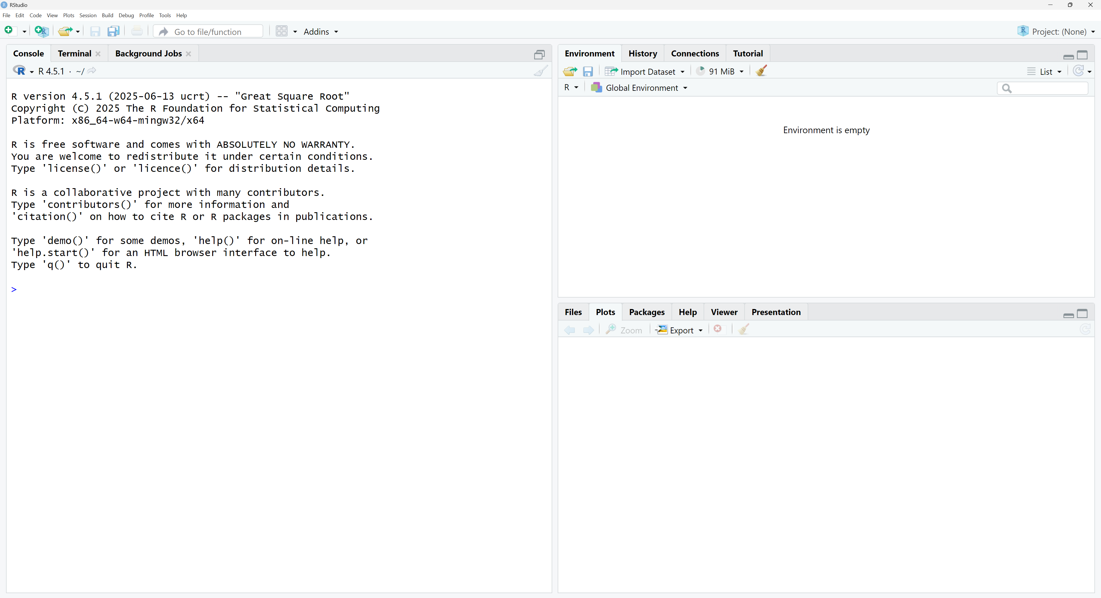 >prompt and press Enter to run it immediately. Printed results, warnings, and error messages appear here. The Terminal tab opens a system shell (Command Prompt on Windows, a Unix shell on macOS); useful for advanced tasks but not needed in ordinary work. Background Jobs manages long-running tasks, another feature for experienced users. - Editor Pane (Top-Left)