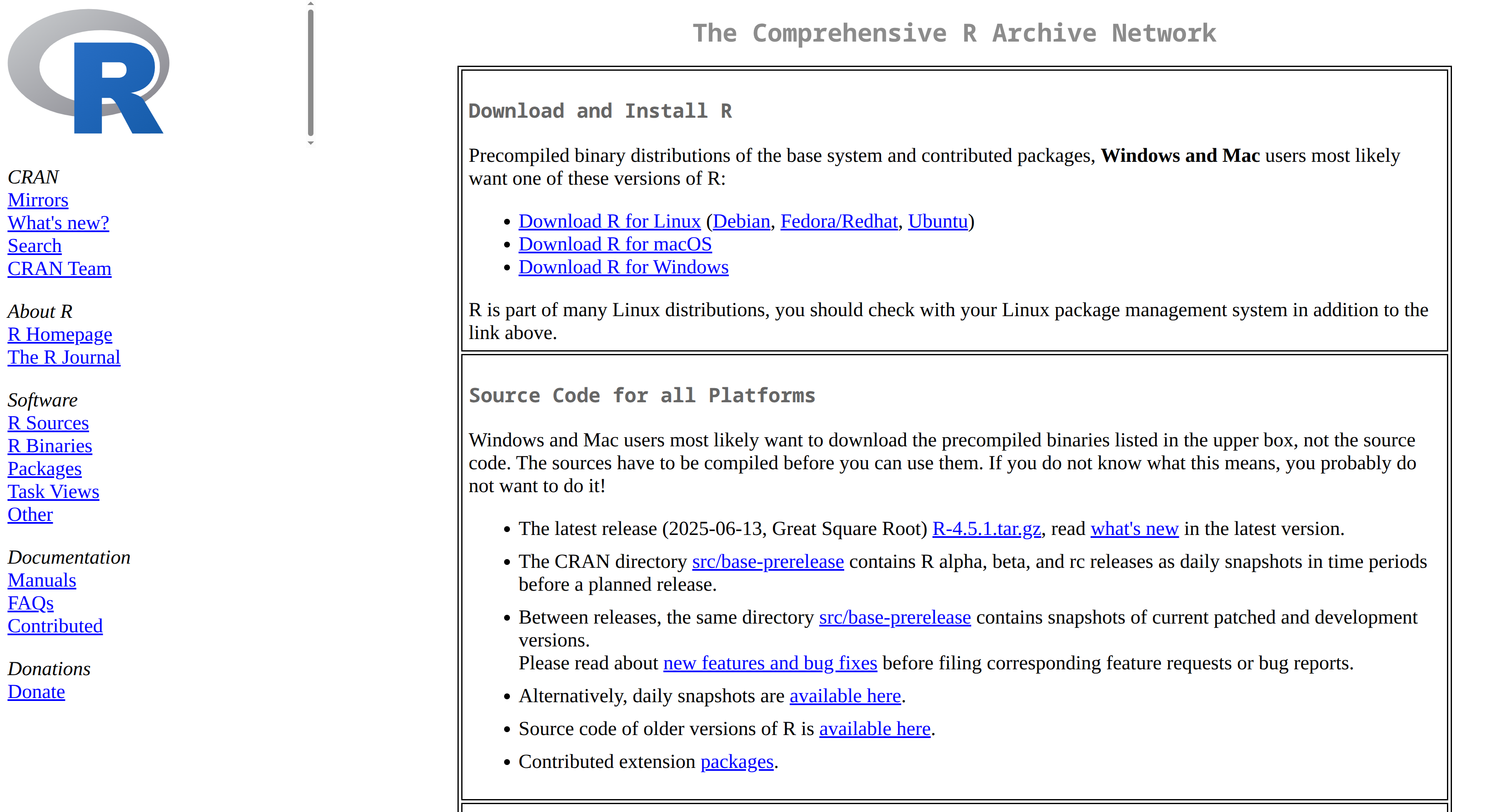 - Click Download R-4.x.y for Windows, where x.y is the current version. For example, on 2 July 2025 the current version was R-4.5.1. Save the file.