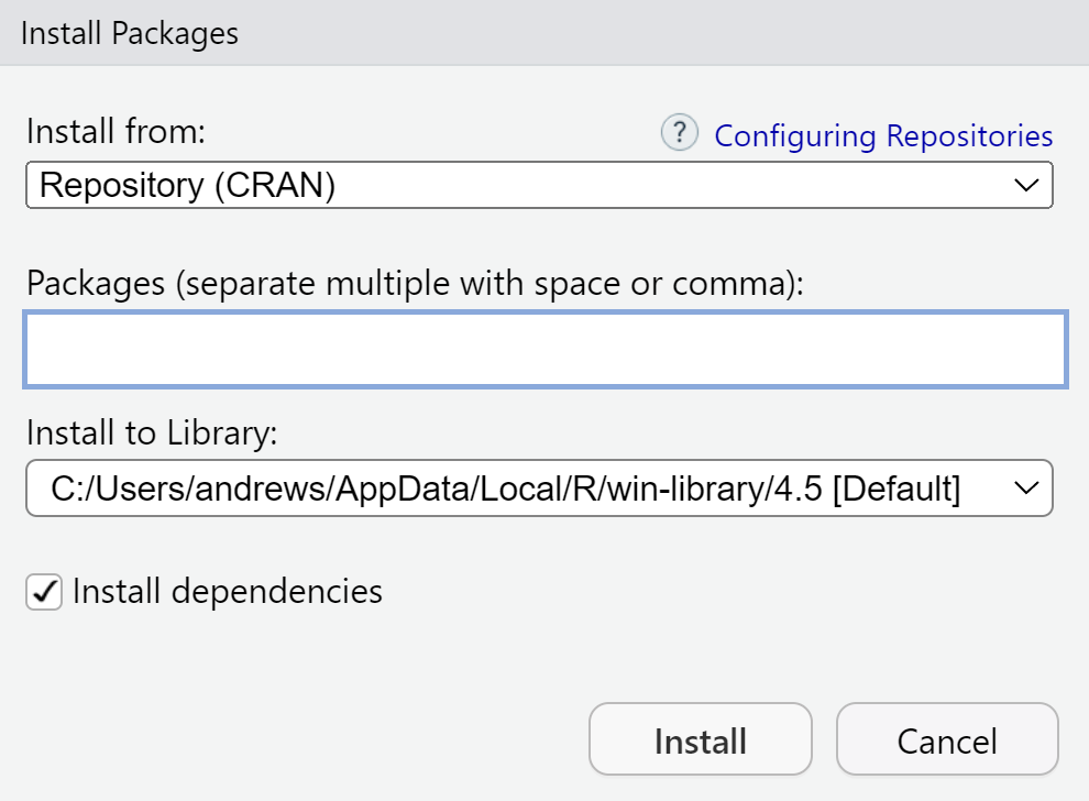 To install any R package, open the Packages tab in the lower-right pane and click Install. The dialogue in Figure Figure 2.4 appears.