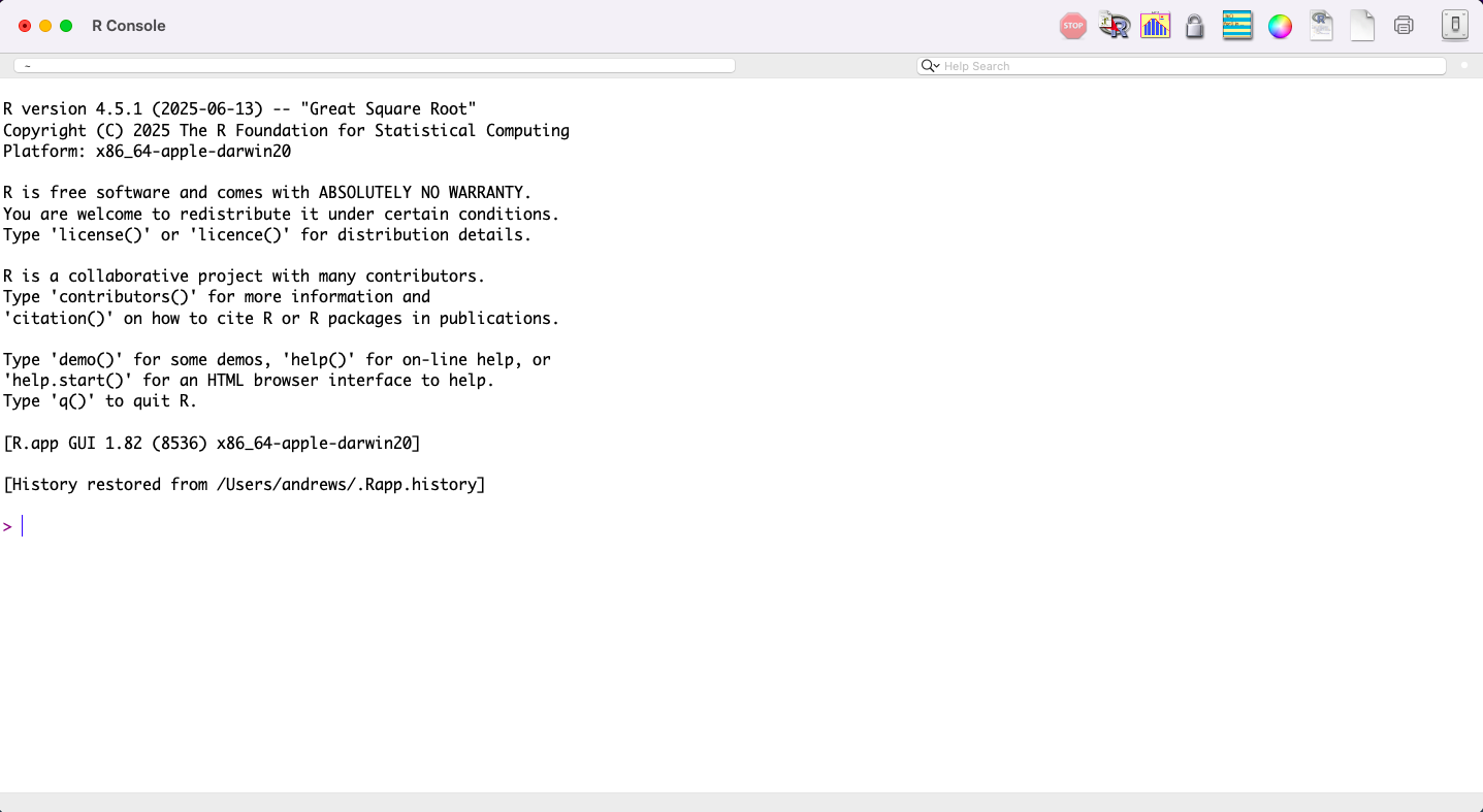 /Library/Frameworks/R.framework. You never need to touch that folder directly. - Open your Applications folder and double-click the R icon (see Figure 2.2 (b)) to verify the installation. Close it before installing RStudio.
