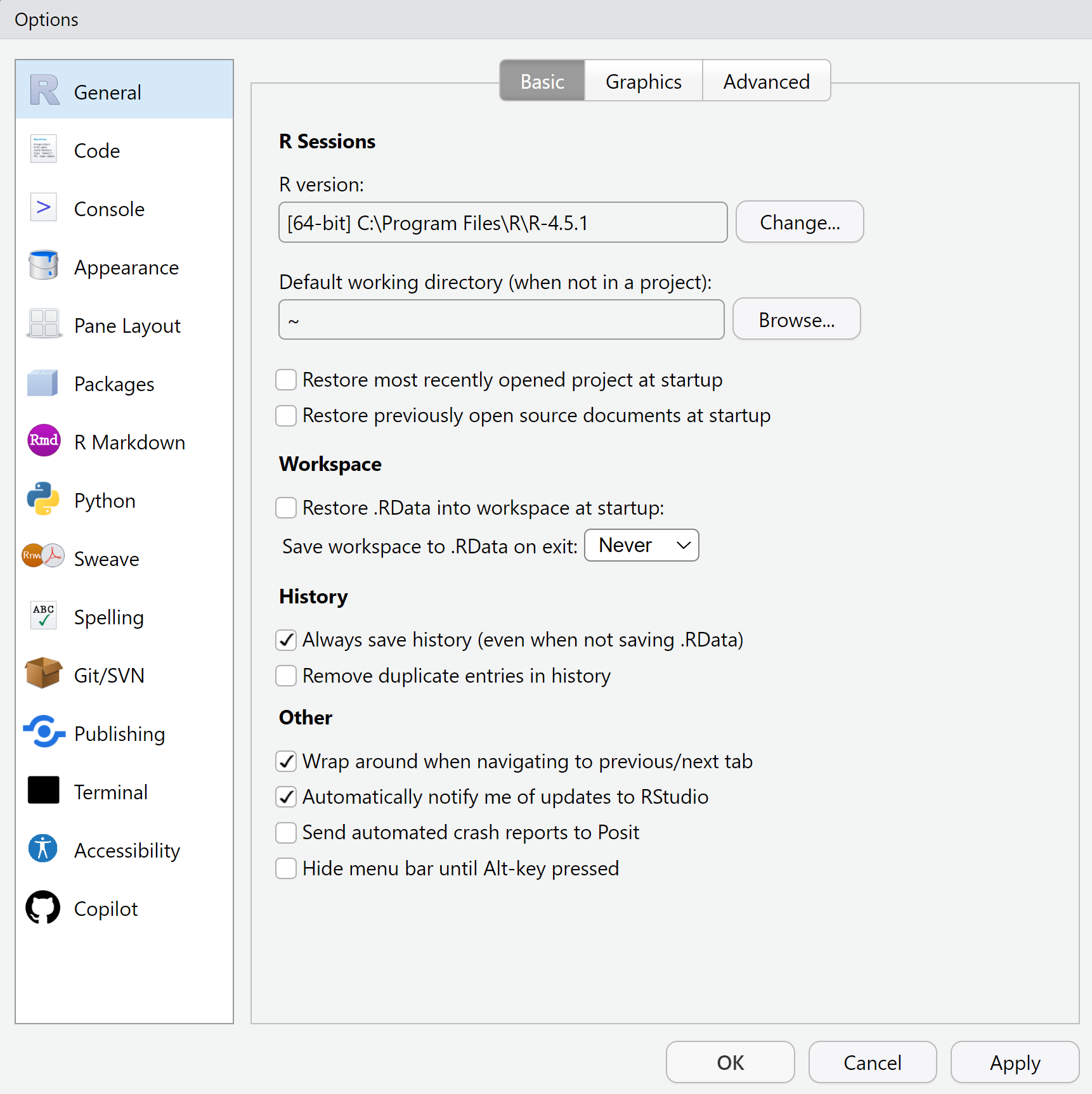 - Allowing R to restore old objects into new sessions — rely on your script as the single source of truth.