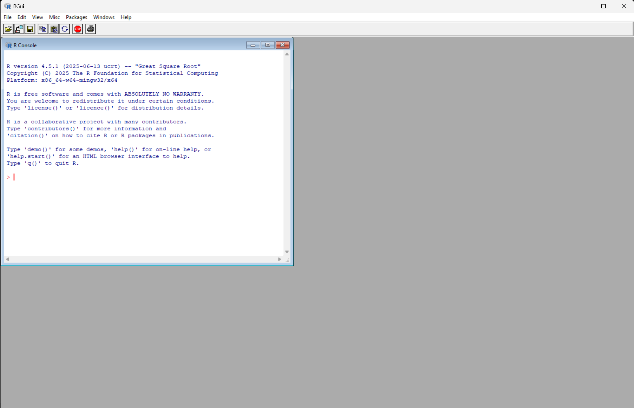 C:\Program Files\R\R-4.x.y\). Click Next on all component screens; the defaults are sensible. - Finish the wizard. A new Start-menu group called R appears. Launch this (see Figure 2.2 (a)) to verify the installation. This minimal interface is unnecessary once RStudio is installed, but opening it confirms that R works. Close it before installing RStudio to avoid conflicts.