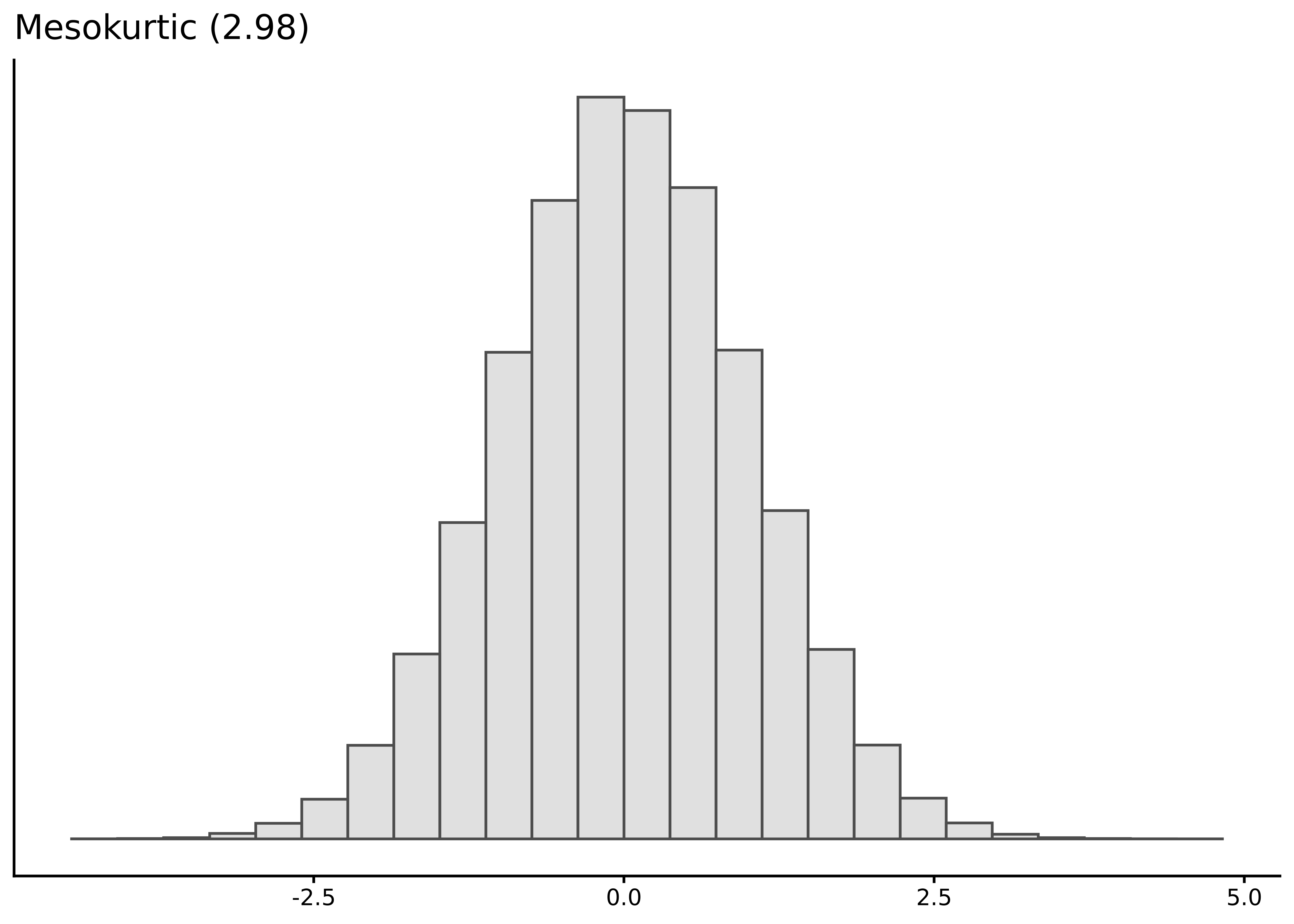 Kurtosis measures tail heaviness relative to a normal distribution. Despite common misconceptions, it reflects tail weight, not peakedness (Westfall, 2014a).