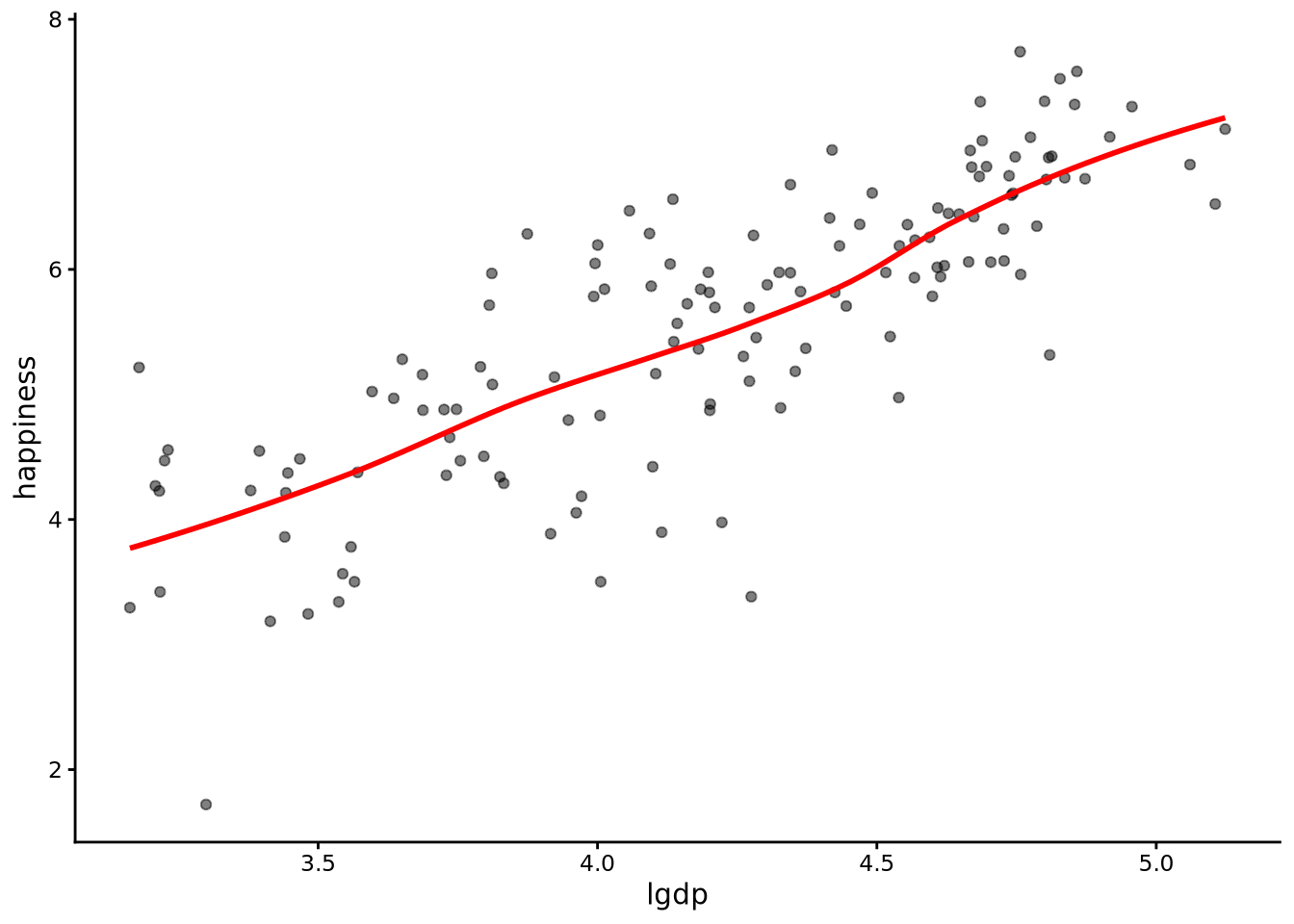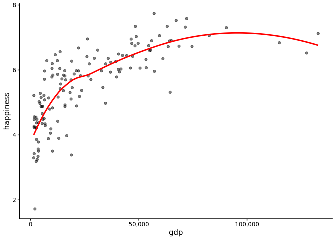 Figure 7.1: Scatterplot of happiness scores versus per capita GDP with a smoother line (red), showing a non-linear relationship with diminishing returns at higher GDP levels where the curve flattens out.