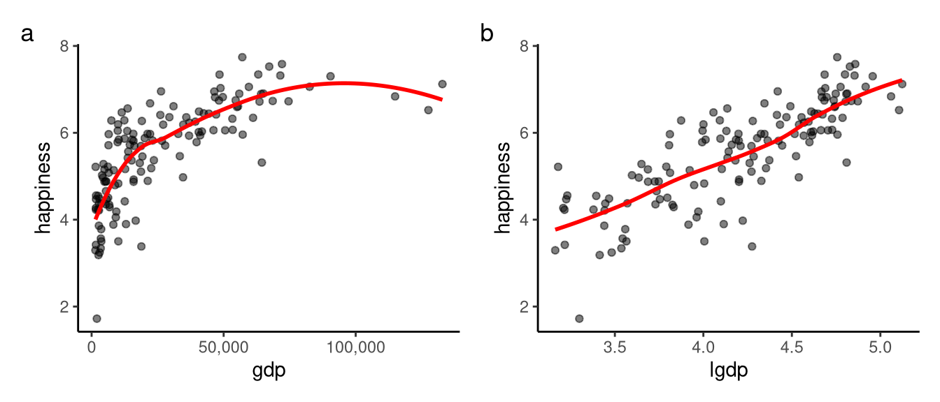 From these scatterplots, we see that average happiness does not change linearly with GDP (Figure 7.1a). At lower levels of income, small increases in GDP are associated with large gains in happiness, but at higher levels of income, further increases have much smaller effects. The red line bends upwards then flattens, showing this pattern of diminishing returns. However, when we plot happiness against the logarithm of GDP (Figure 7.1b), the relationship becomes roughly straight, and we can say that happiness changes linearly with the logarithm of GDP. By “changes linearly,” we mean that as one variable increases by a fixed amount, the other variable changes on average by another fixed amount.