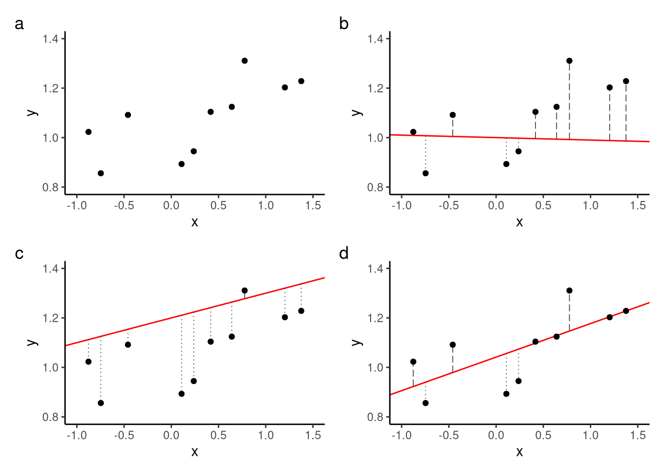 Figure 7.4: A scatterplot (a) being fit by three different lines (b, c, d). For each line, the fit is measured by the RSS. The residuals are depicted by the vertical lines above or below the fitted line. Each line in b, c, d is defined by different values for its slope and intercept. As we change these values, we may get the line closer to some points but farther from others. The line with overall best fit of all possible we could draw is the line in d).