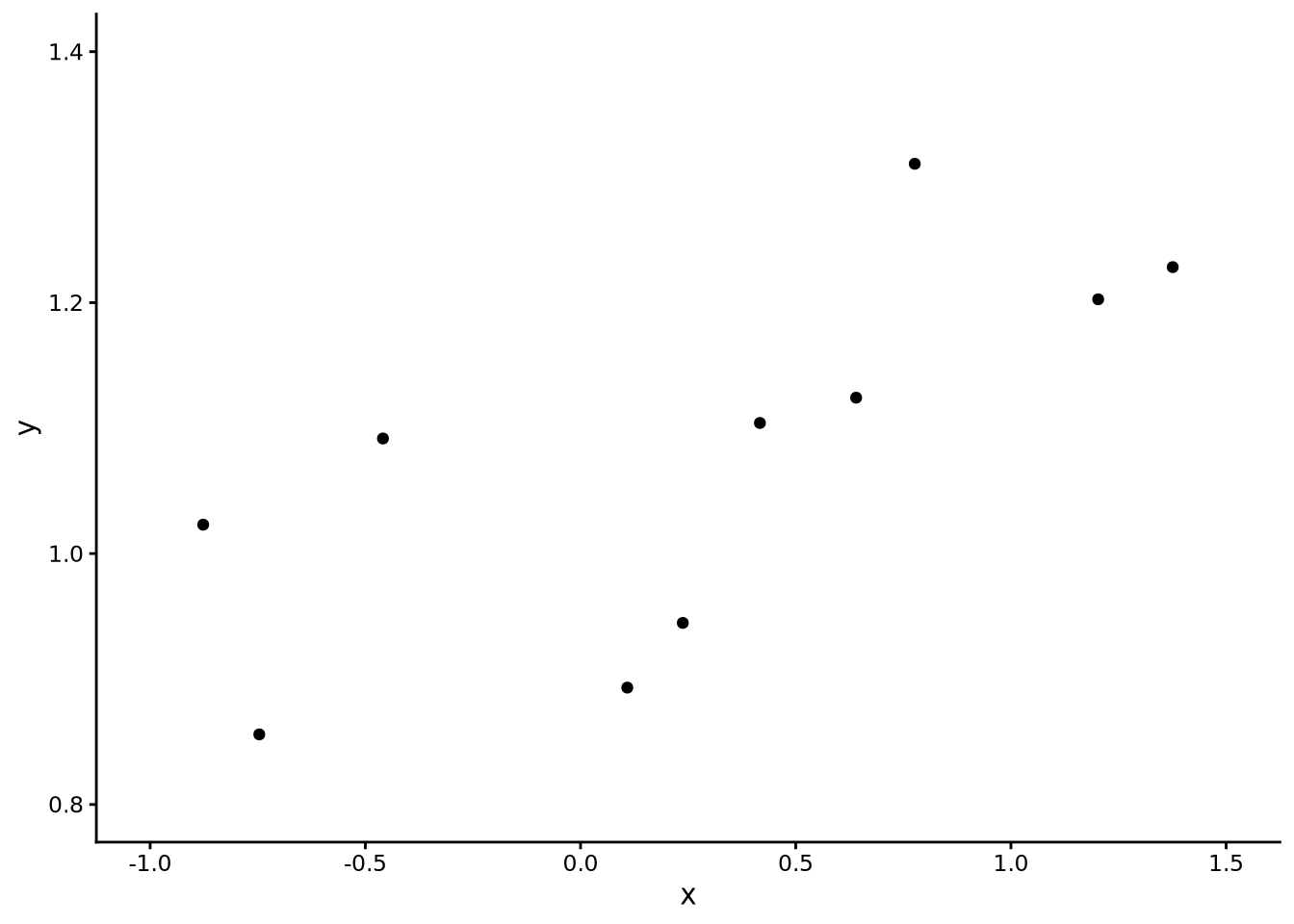 Figure 7.5: A scatterplot showing the relationship between two variables x and y, with 10 data points displayed without any fitted line.