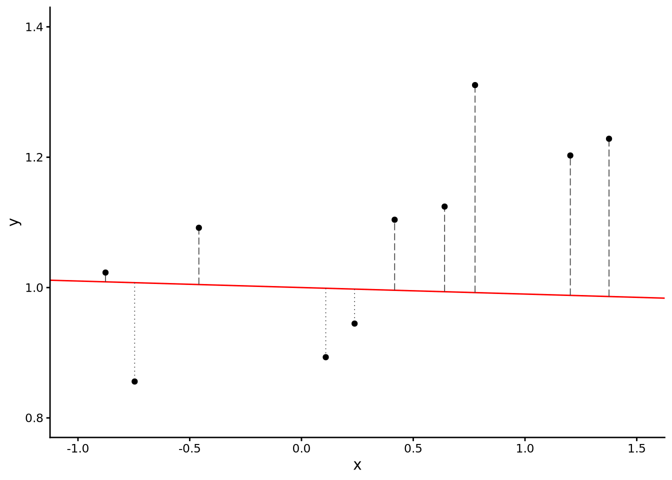 Figure 7.7: The same scatterplot with a moderately fitting line (intercept = 1.2, slope = 0.1). The residuals are shown as vertical dashed lines, with a better fit than the previous line but still not optimal.