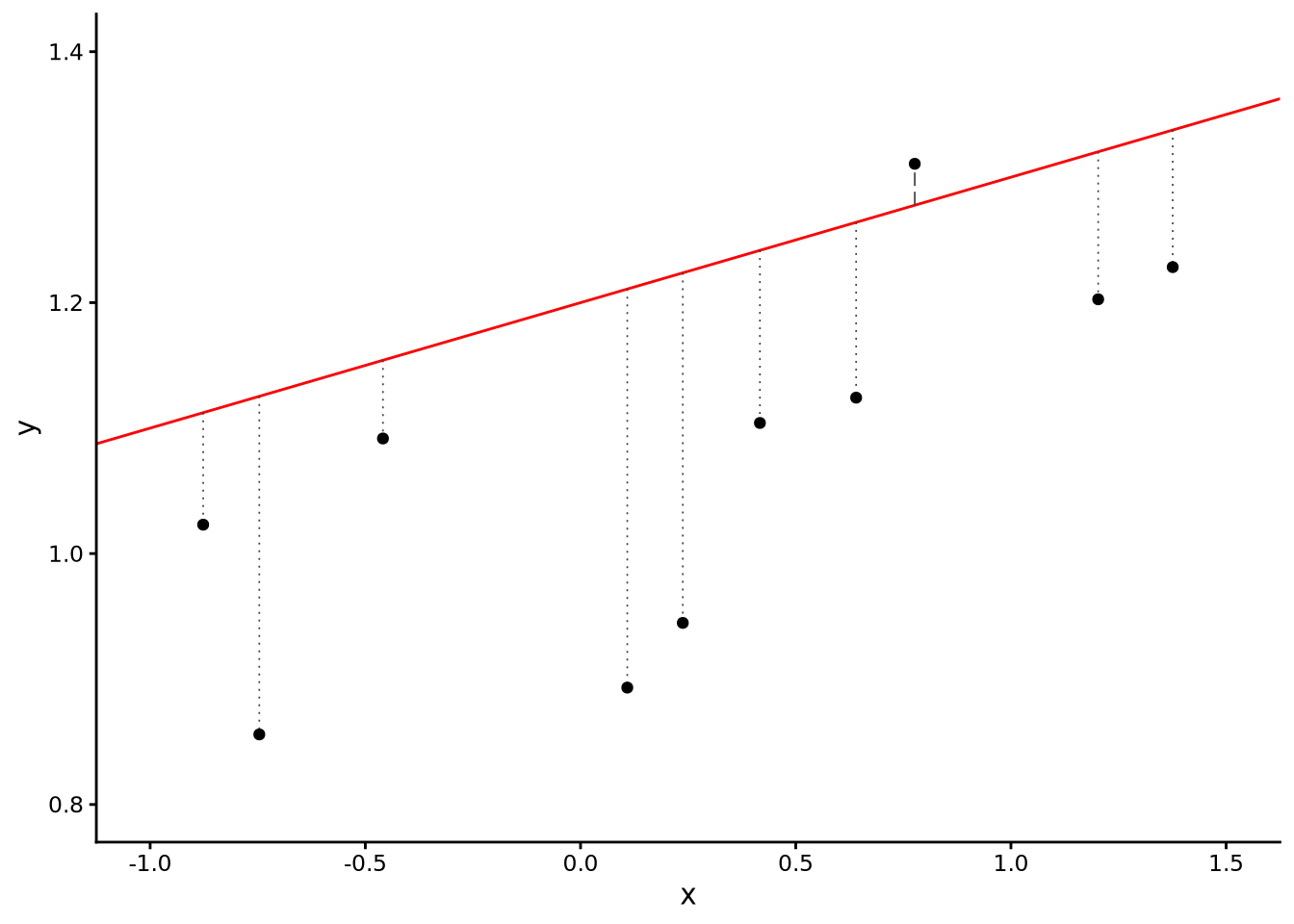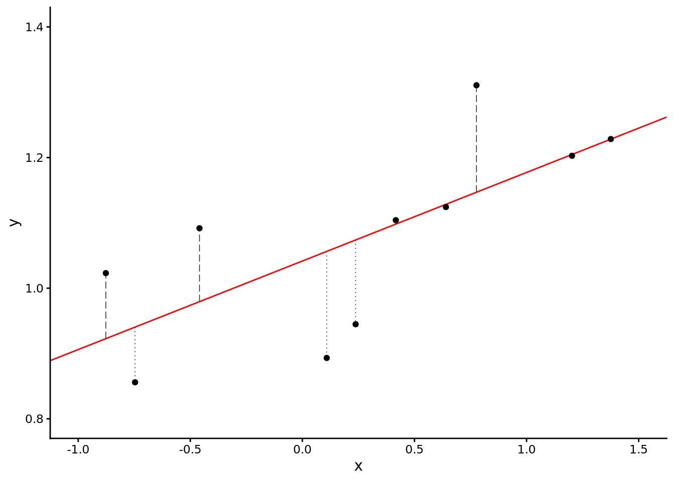 \] where each \(\epsilon_i\) is sampled from a normal distribution with a zero mean and standard deviation of \(\sigma\). There is no difference between these two ways of writing the model. Mathematically, they are identical. Both forms are useful. The first form, even if it seems more involved, centres the focus on the outcome variables being normally distributed around a mean (\(\mu_i\)) that varies as a linear model, thus making the underlying statistical model more clear. Taking this perspective also makes it much easier to see how linear regression models can be extended to different types of regression models. The second form expresses each observed value \((y_i)\) as the sum of two parts: a systematic part (\((\beta_0 + \beta_1 x_i)\)) that gives the straight line, and a random part (\(\epsilon_i\)) that represents how far the point lies above or below that line. The residuals \((\epsilon_i)\) are assumed to follow a normal distribution centred on zero, which means that, on average, half the points fall above and half fall below the fitted line.