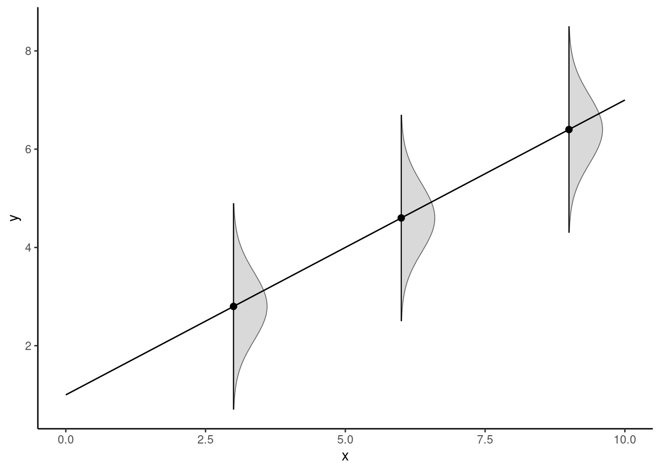 Figure 7.3: The statistical model inherent in simple linear regression assumes that for every possible value of the predictor variable \(x\), the distribution over \(y\) is normal with a fixed standard deviation — a property known as conditional normality