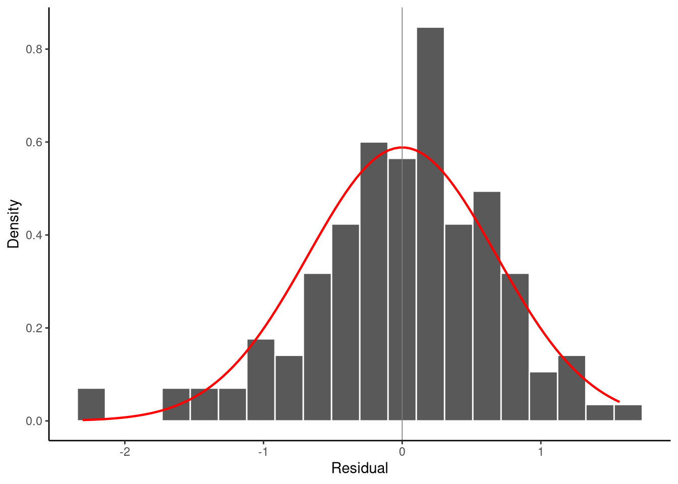 For the happiness ~ lgdp model, there is no obvious systematic curve, which supports the choice of a straight‑line mean on the logarithmic GDP scale. The spread does not noticeably increase or decrease with the fitted values, so there is no strong evidence of heteroscedasticity. The residuals mostly occur within \(\pm 2\) times the residual standard deviation (\(\hat{\sigma} = 0.68\)), but the plot does show some points somewhat below the band, consistent with the negative skew we saw earlier.