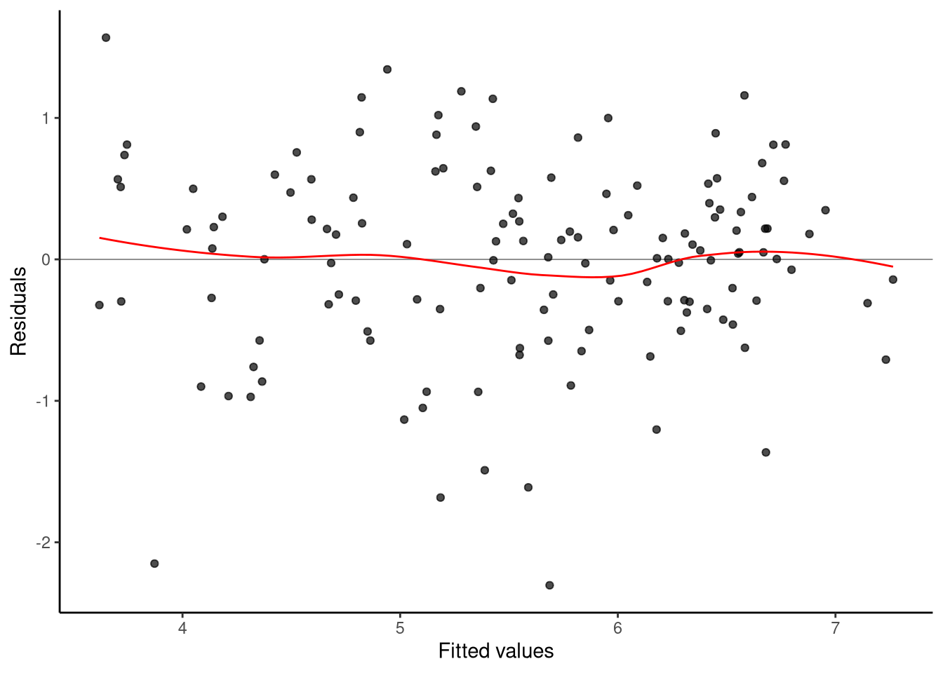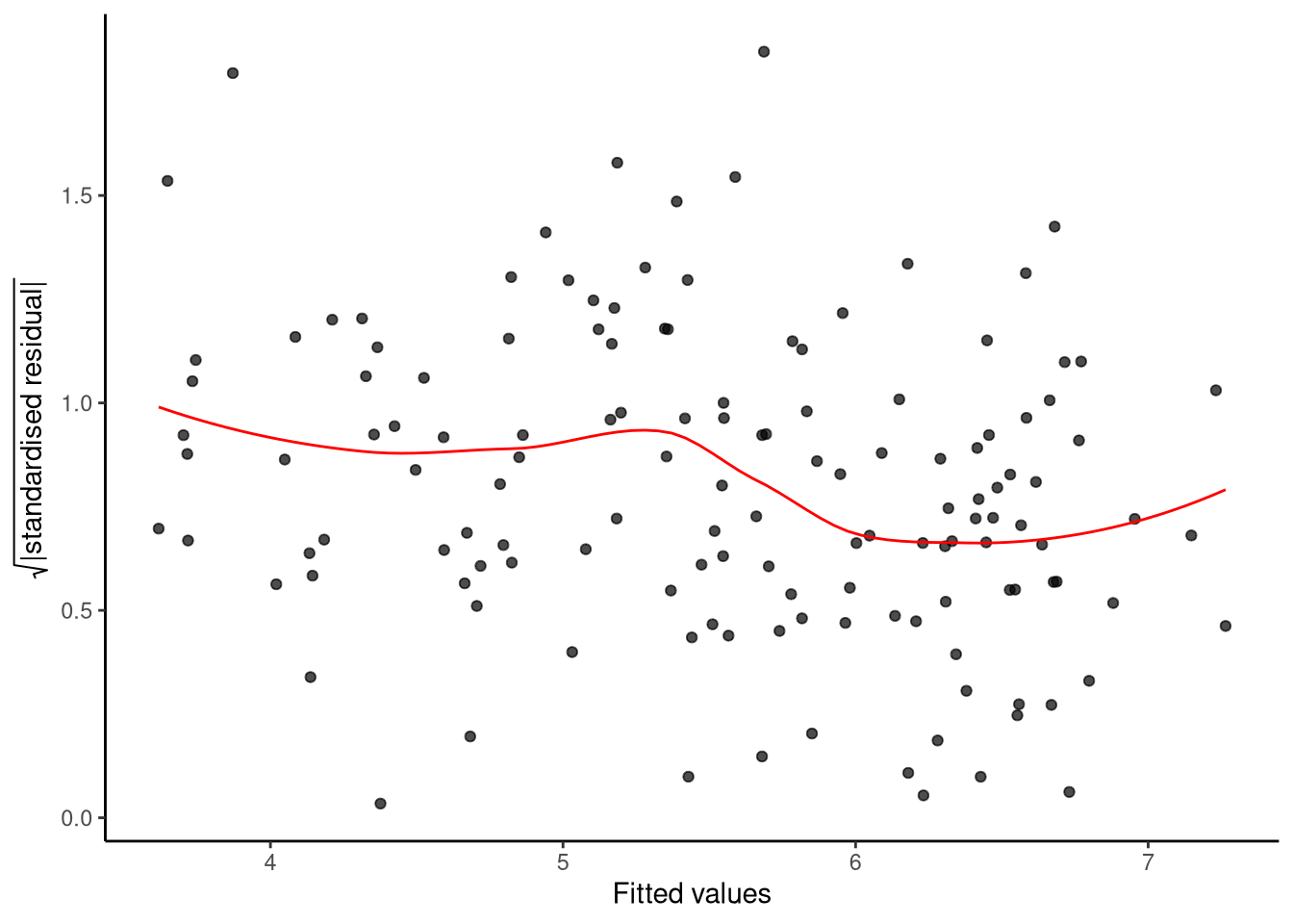 For the current model, the points form a fairly level band across the fitted range, with only mild variation, so the constant‑variance assumption appears reasonable. There is no clear upward trend at high fitted values, which supports the use of a single residual standard deviation \(\sigma\), as is the standard assumption in linear regression. If a noticeable trend were present, a variance‑stabilising transformation or heteroscedasticity‑robust standard errors would be worth considering.