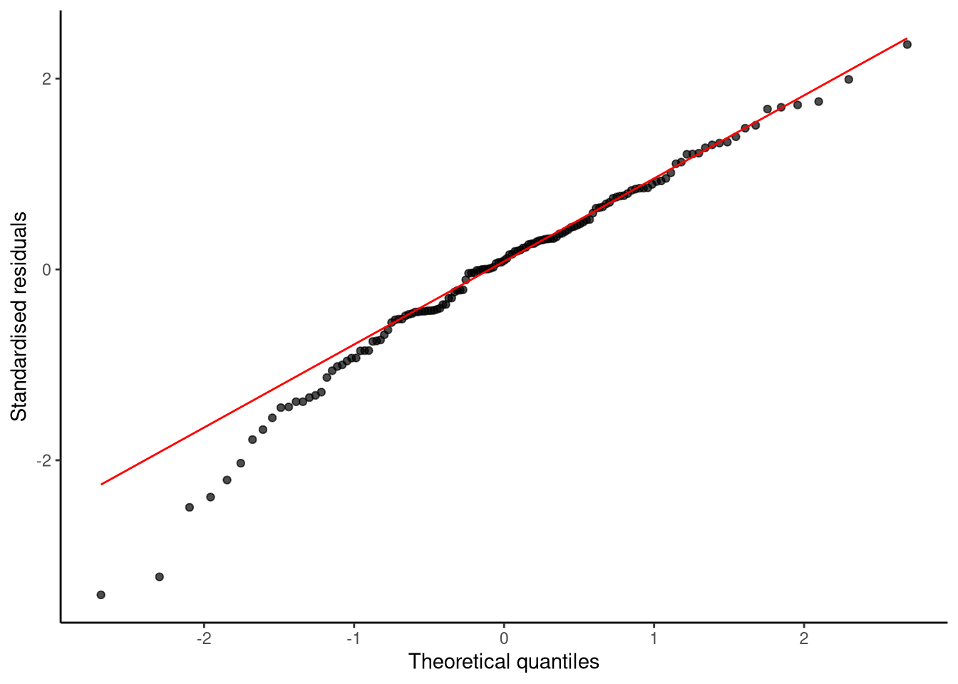 As covered in Section 6.4, the Q–Q plot orders the standardised residuals and compares them to the quantiles of a standard normal distribution. Points close to the diagonal reference line indicate residuals that are close to normal; systematic S‑shapes indicate skewness, and tails that bend away from the line indicate heavier‑than‑normal tails.