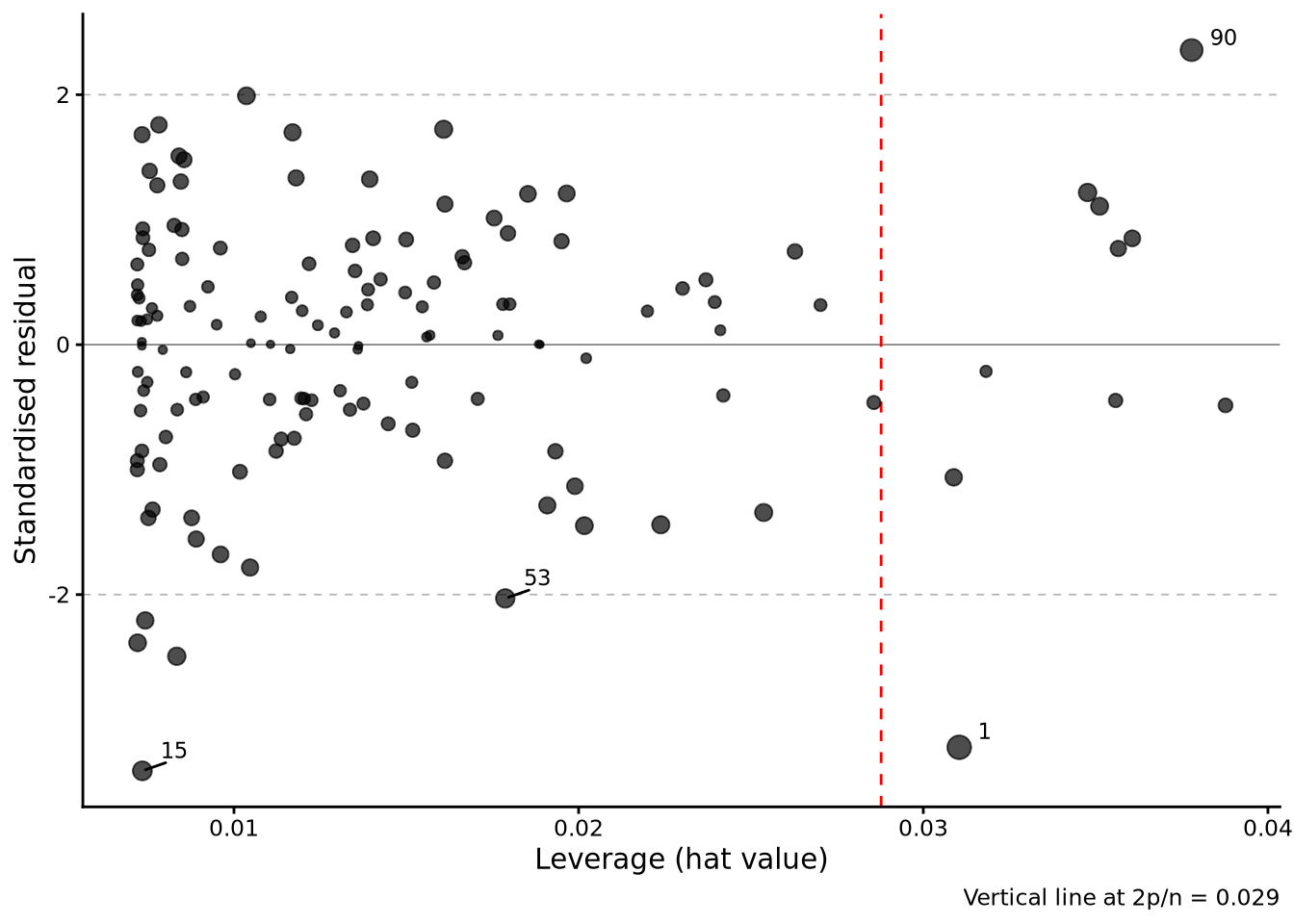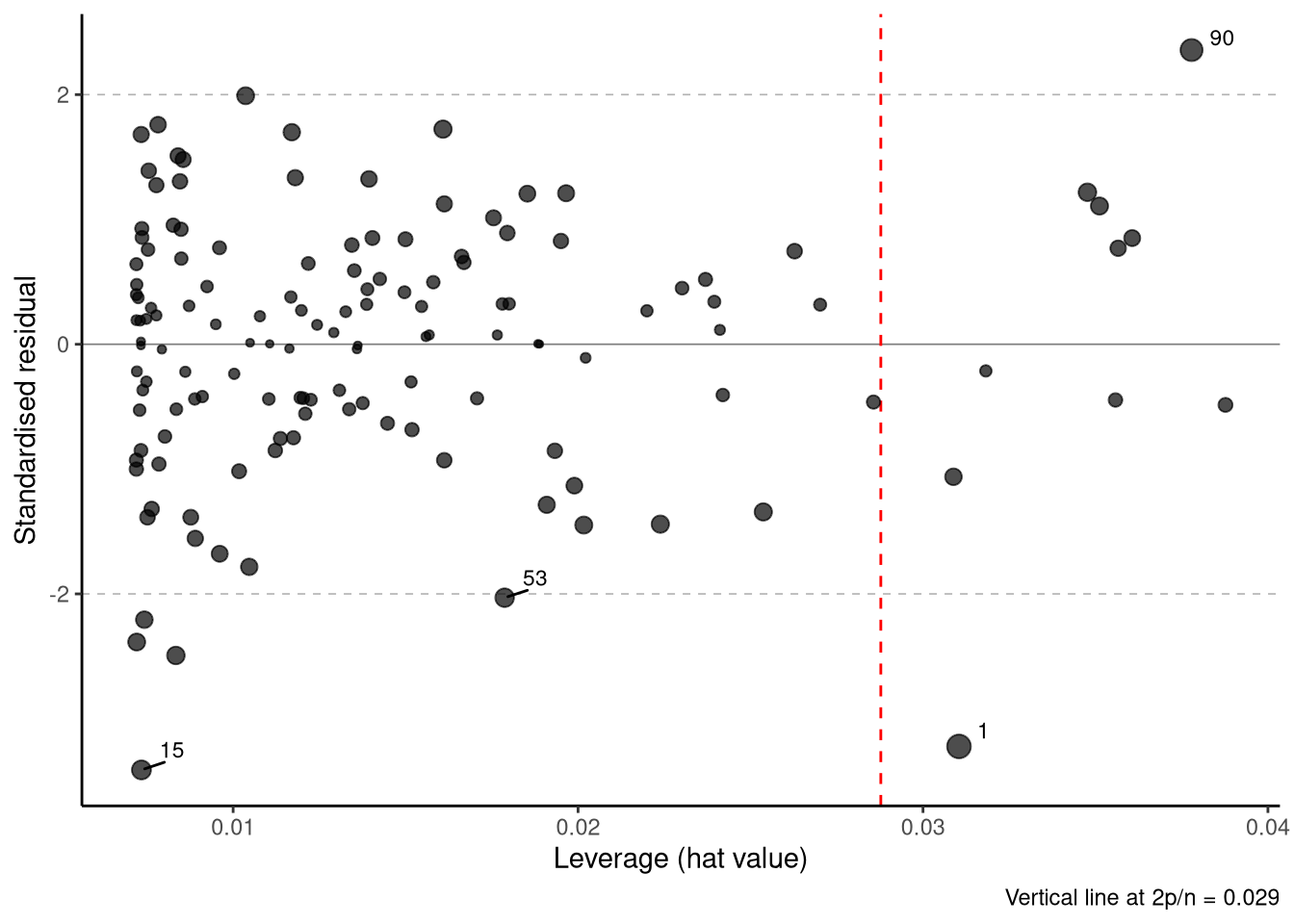 Large influence typically requires both a large residual and high leverage. A measure named Cook’s distance combines these ingredients. Specifically, Cook’s distance for any given observation combines its residual and leverage to measure how much all fitted values would change if that point were left out. Each point in this plot is scaled by its Cook’s distance to highlight potentially influential observations, and those points whose Cook’s distance is above 4/n are labelled, where 4/n is a rough rule of thumb to flag influential points.