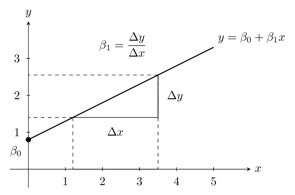 Figure 7.2: A straight line illustrating the linear function \(y = \beta_0 + \beta_1 x\). The point where the line crosses the \(y\)-axis is the intercept \(\beta_0\). The slope \(\beta_1\) is the change in \(y\), represented by \(\Delta y\), over the corresponding change in \(x\), represented by \(\Delta x\). In other words, when \(x\) changes by \(\Delta x\), then \(y\) changes by \(\Delta y\) where \(\Delta y = \beta_1 \Delta x\).