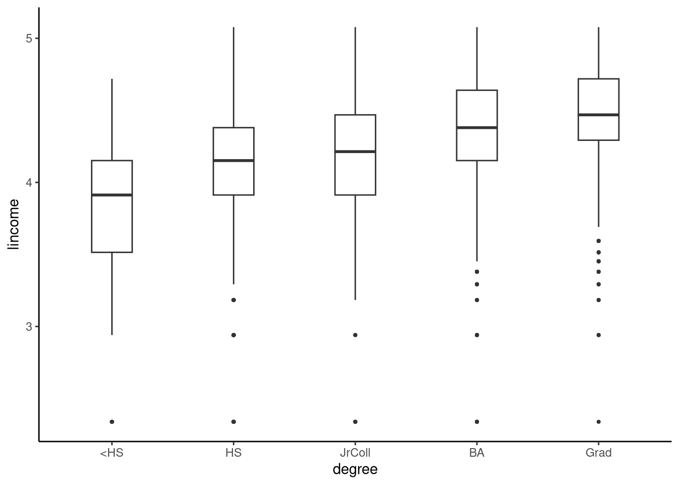 The gss2021 dataset in sgsur provides a subset of variables from the 2021 edition of the General Social Survey (GSS). The GSS is a nationally representative survey conducted by the University of Chicago that has tracked American social attitudes, behaviours, and demographic characteristics since 1972. In Figure 9.1, using the gss2021 dataset, we show boxplots of the logarithm (base 10) of personal income (lincome) for each of five groups of people, defined by their level of education (degree). The levels of education are less than high school (<HS), high school (HS), junior college (JrColl), university undergraduate degree (BA), and post-graduate degree (Grad). We use the log of income (lincome) rather than income itself as the outcome variable given that income is highly right skewed but its log transform is closer to symmetrical and bell-shaped.