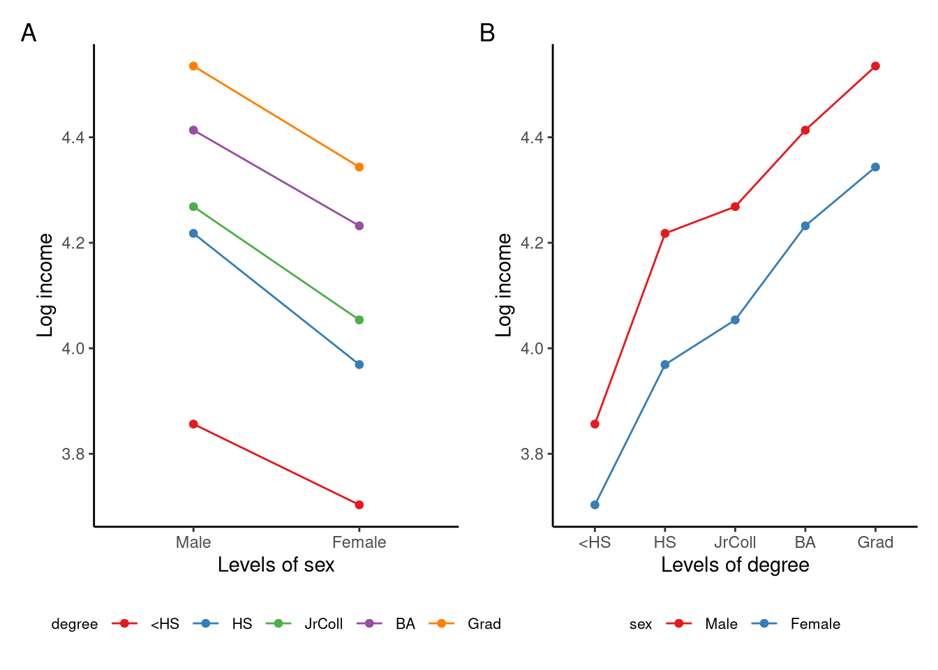 Here, we are using emmeans() to calculate the predicted average log income for every combination of age in age_seq and level of education, which we could also have done using augment() (see, for example, Section 7.6 and Section 8.10) or other tools.