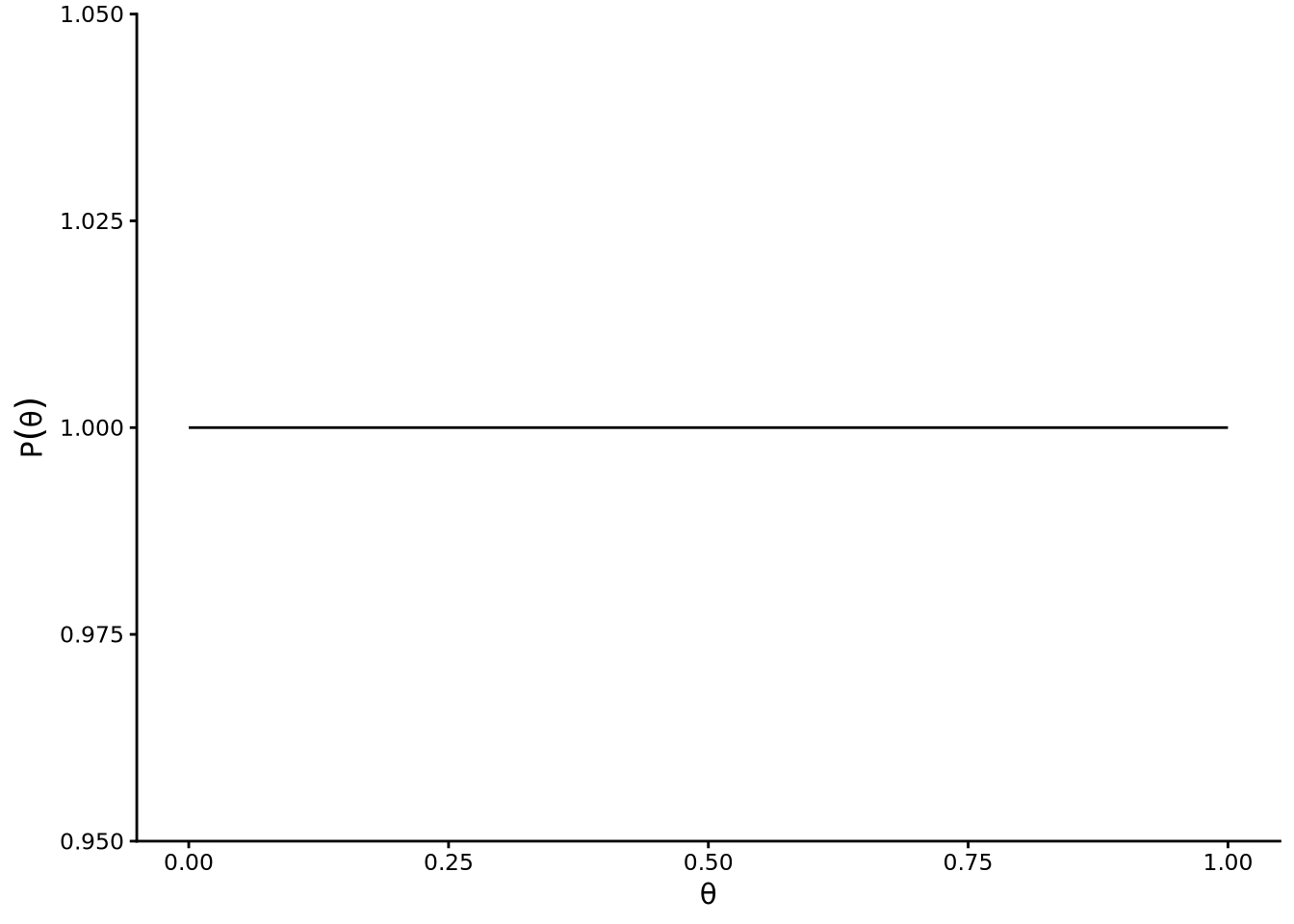 The second term in the numerator of the Bayes rule equation is \(\Prob{\theta = \tilde{\theta}}\). This is known as the prior probability, or simply the prior. The prior allows us to specify the range of possible values that \(\theta\) can take, and what their relative probabilities are. Ultimately, the prior is an assumption, but one that should, like any assumption in statistical analysis, be reasonable and based on what is known about the problem at hand. In Section 6.4, we discussed the general topic of assumptions in statistical models, and these discussions will allow us to further discuss what priors are and how to choose them. For now, we will keep matters very simple and just assume that \(\theta\) could have any possible value with equal probability. This is known as a uniform prior. It is a flat line function over \(\theta\), see Figure 14.2.