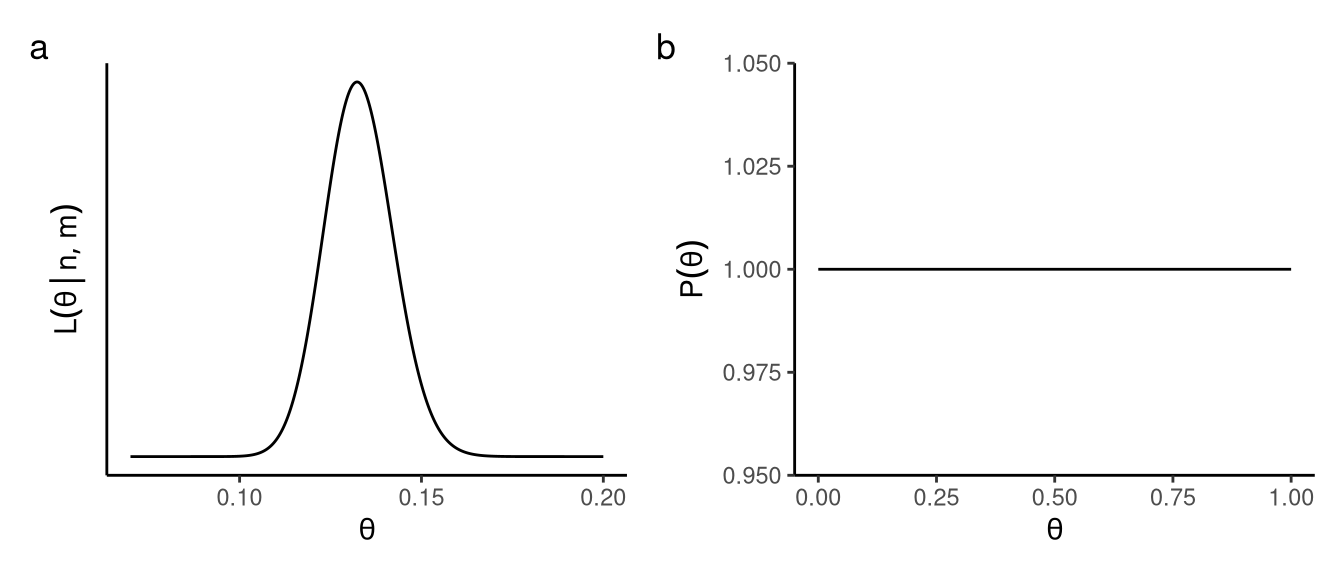 The second term in the numerator of the Bayes rule equation is \(\mathrm{P}\!\left(\theta = \tilde{\theta}\right)\). This is known as the prior probability, or simply the prior. The prior allows us to specify the range of possible values that \(\theta\) can take, and what their relative probabilities are. Ultimately, the prior is an assumption, but one that should, like any assumption in statistical analysis, be reasonable and based on what is known about the problem at hand. In Section 6.4, we discussed the general topic of assumptions in statistical models, and these discussions will allow us to further discuss what priors are and how to choose them. For now, we will keep matters very simple and just assume that \(\theta\) could have any possible value with equal probability. This is known as a uniform prior. It is a flat line function over \(\theta\), see Figure 14.2(b).