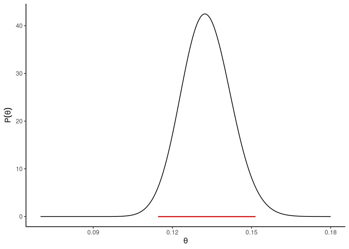 We can be even more precise in our summary of the posterior distribution. For example, we can show that the probability that the true value of \(\theta\) is between 0.115 and 0.151 is exactly 95%. This interval, which is known as the 95% high posterior density (HPD) interval, is shown as the red line in Figure 14.3. Any value of \(\theta\) in that interval has a higher probability than any value outside of it, and the total probability of a value of \(\theta\) being in that interval is exactly 95%. This HPD interval is comparable to the confidence interval we discussed in the previous section in the sense that it gives us a range of values of \(\theta\) that have a degree of support from the data in some sense. However, the meanings and the interpretations of the classical confidence interval and the HPD interval are different. The classical 95% confidence interval is the range of values of \(\theta\) that have a hypothesis test p-value of \(p > 0.05\). In other words, these are the range of values of \(\theta\) that are compatible with the data according to hypothesis tests. As mentioned earlier, a common misinterpretation of the 95% confidence interval is that there is a 95% probability that the true value of \(\theta\) is in the range. On the other hand, this is the correct interpretation of the 95% HPD interval. It is true that the probability that \(\theta\) is in the 95% HPD interval is exactly 95%. In other words, in this case, we can be 95% certain that the true value of \(\theta\) is between 0.115 and 0.151.