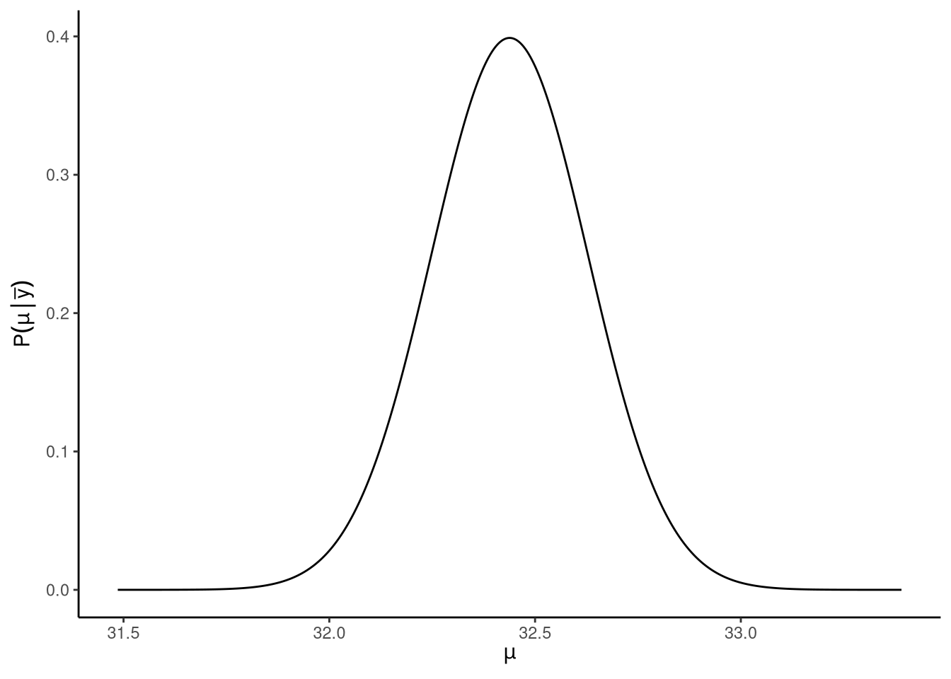 Let us now consider Bayesian inference of the mean \(\mu\) of a normal distribution. Our starting point is identical to that of the classical approach. Specifically, we assume we have \(n\) independent observations that can be represented as follows \[ y_1, y_2, \ldots y_n, \] and we assume the following model: \[ y_i \sim N(\mu, \sigma^2),\quad\text{for $i \in 1 \ldots n$}, \] where both \(\mu\) and \(\sigma\) have fixed but unknown values. Inference in Bayesian approaches, just like in classical approaches, aims to infer what these values are. As we mentioned above, the theoretical basis of Bayesian inference differs markedly from the classical approach. Nonetheless, and just as we saw earlier, the ultimate conclusions may still be remarkably similar to one another.